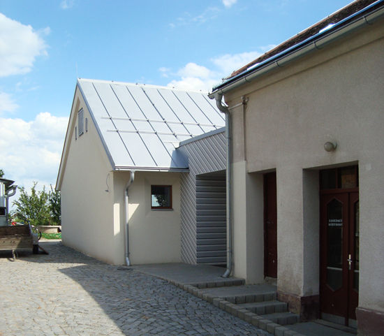Přístavbou ke stávajícímu objektu Obecního úřadu vznikají dvě nové kanceláře, okénko při vstupu vede do kanceláře starosty a symbolizuje otevřenost úřadu a možnost kontroly voleného zástupce občany. Přístavba je navržena s osou kolmou k hranici pozemku, otočení hřebene oproti stávajímu objektu vychází z koncepce hospodářské budovy za budovou hlavní, která tak vymezuje dvůr a místo hlavního vstupu.